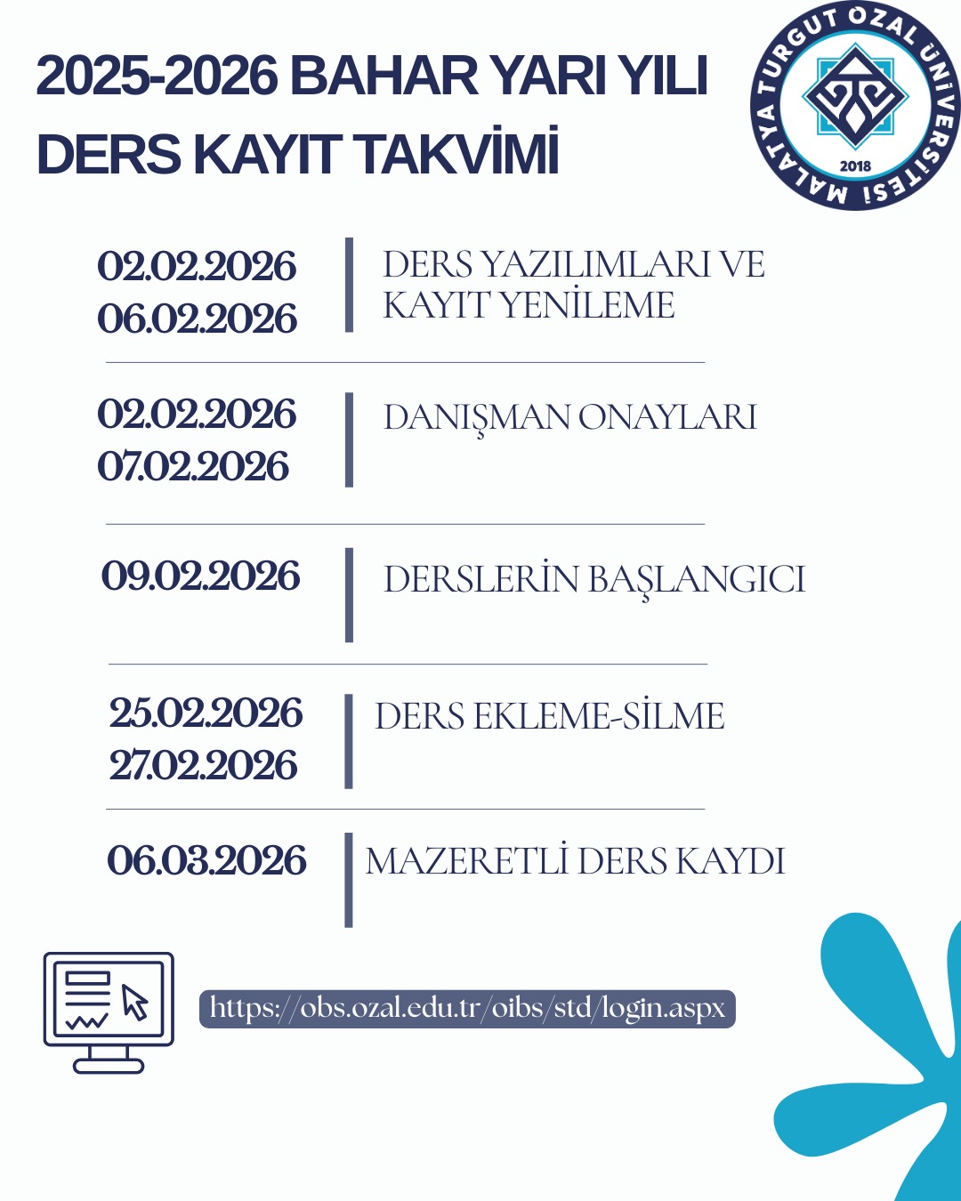 - Ders Yazılımları ve Kayıt Yenileme: Ders seçim işlemleri 02.02.2026 tarihinde başlayıp 06.02.2026 tarihinde sona erecektir.