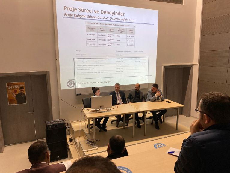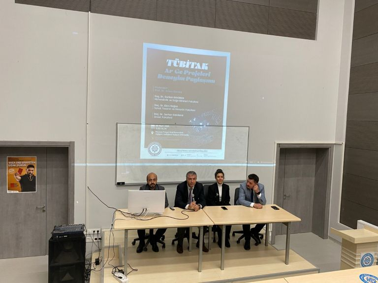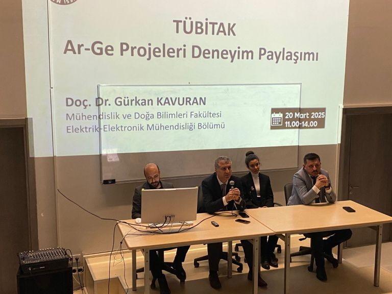 “TUBITAK R&D Projects Experience Sharing” event was held by the Research Coordinatorship of our University on March 20, 2025. Under the moderation of Vice Rector Prof. Dr. Orhan GÜNDÜZ, Assoc. Prof. Dr. Gürkan KAVURAN from the Faculty of Engineering and Natural Sciences, Assoc. Prof. Dr. Ebru Doğan, Vice Dean and Head of the Department of Interior Architecture from our Faculty, and Assoc. Prof. Dr. Serhan CANDEMİR from the Faculty of Agriculture shared general information about TÜBİTAK project applications, as well as the issues to be considered in project writing and project management, and their experiences in the evaluation processes of projects.