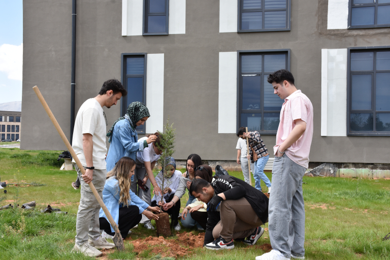 Malatya Turgut Özal University held a sapling planting event in the garden of our faculty on Friday, April 25, 2025, within the framework of the “Sapling Planting Event on the Green Campus Journey” organized within the scope of March 30 International Zero Waste Day. The event, organized in cooperation with the Sustainable University Coordinatorship and Zero Waste Management Coordinatorship, was attended by STMF Dean Prof. Dr. Ersan Çiftci, Deputy Dean Assoc. Prof. Dr. Ferdi Karaönçel, Music Department lecturer and also Faculty Secretary Assoc. Assist. Harun Barış, faculty academic and administrative staff and students attended the event. Yeşilyurt Aspuzu Kindergarten students also accompanied the event and created cheerful and colorful images during the sapling planting. While the little students were excited to contribute to nature, the event once again reminded the participants of the importance of environmental awareness. The event ended with watering the saplings and taking a group photo.