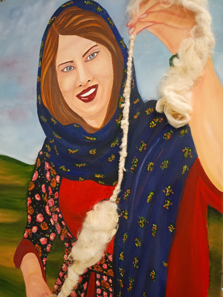 Yüsra Can, a second-year student in the Painting Department, commented on her work, saying, “Village life is a different and meaningful world for me. For this reason, I created a work focusing on local Anatolian women and tried to express my feelings in this way.”
