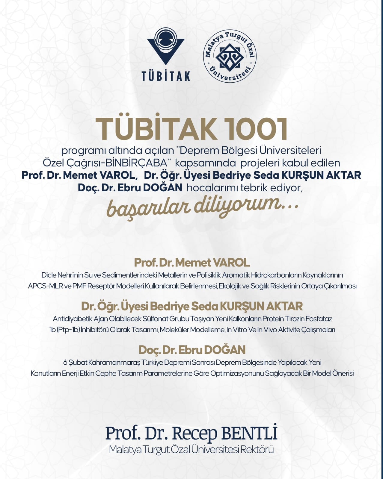 We congratulate Assoc. Prof. Dr. Ebru DOĞAN, whose project was accepted within the scope of “Special Call for Earthquake Region Universities - BINBİRÇABA” opened under the TÜBİTAK 1001 Program.