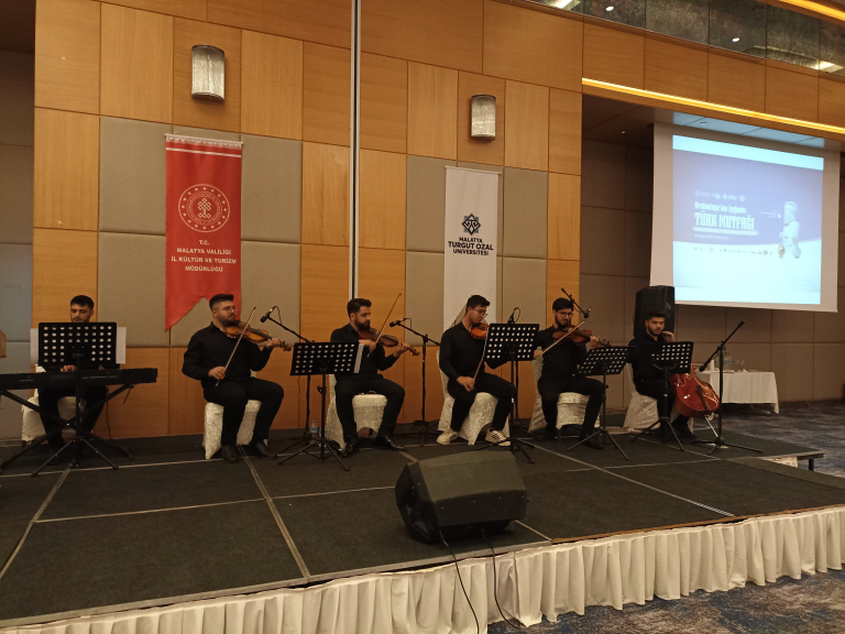 Malatya Turgut Özal Üniversitesi Sanat, Tasarım ve Mimarlık Fakültesi Müzik Topluluğu öğrencileri, Kale Turizm ve Otel İşletmeciliği Meslek Yüksekokulu tarafından düzenlenen “Arslantepe’nin Işığında Türk Mutfağı Üniversiteler Arası Yemek Yarışması”nın ödül töreninde sahne aldı. Ödül törenine müzikal anlamda renk katan topluluk, Öğr. Gör. Harun Barış’ın sanat yönetmenliğinde sahneye çıktı. Piyanoda Ramazan Kaya, birinci kemanda Baran Sarıgül, ikinci kemanda Eyyüp Çetinkaya ve Hulusi Önat, viyolada Eren Hasar ve viyolonselde Barkın Sarıgül yer aldı; topluluk, klasik müzik repertuvarından seçilen eserlerle dinleyicilere keyifli anlar yaşattı. Dinleti sonunda katkılarından dolayı Rektör Yardımcısı Prof. Dr. İlhan Erdem tarafından Öğr. Gör. Harun Barış’a plaket takdim edildi.