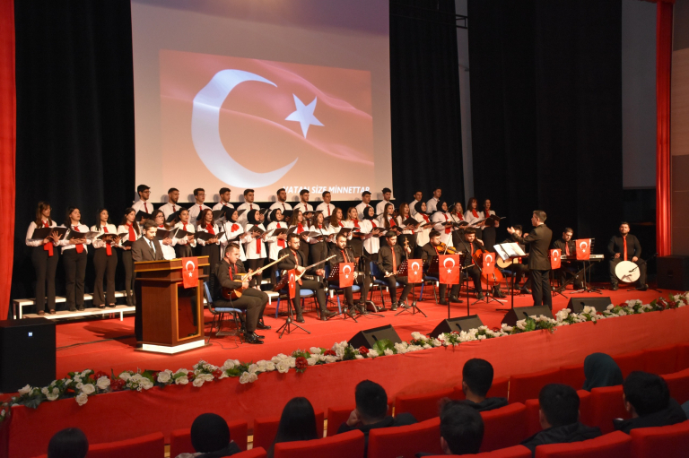 Malatya Turgut Özal Üniversitesi Sanat Tasarım ve Mimarlık Fakültesi Müzik Bölümü tarafından gerçekleştirilen, “Türkülerimizle Çanakkale Zaferi Konseri” kapsamında düzenlenen etkinlikte müzik bölümü öğrencileri sahne aldı. Etkinliğe rektör yardımcılarımız Prof. Dr. İlhan ERDEM ile Prof. Dr. Orhan GÜNDÜZ, genel sekreterimiz Doç. Dr. Ahmet Selim ÖZKAN, öğretim elemanlarımız, idari personel ve üniversite öğrencilerimiz katılım sağladı. Konser kapsamında Umut Konteyner Kentte ikamet eden katılımcılarımız da misafir edildi. Sanat yönetmenliğini Prof. Dr. Ersan ÇİFTCİ’ nin koro şefliğini ise müzik bölümü Öğr. Gör. Harun BARIŞ’ ın yaptığı etkinlikte sinevizyon gösterimi eşliğinde dönemin mücadele ruhunun anlatıldığı ve Çanakkale Zaferi hikayelerini konu alan “Mehrali Bey Ağıtı (Ben Gidiyorum Rüştü Beyim), Havada Bulut Yok (Yemen Türküsü), Çanakkale İçinde Aynalı Çarşı, Alay Marşı (Annem Beni Yetiştirdi), Cabur Dağdan Kuş Geliyor, Plevne Marşı (Tuna Nehri Akmam Diyor) ve Çanakkale Bugün Toz İle Duman” türküleri koro halinde seslendirildi.
