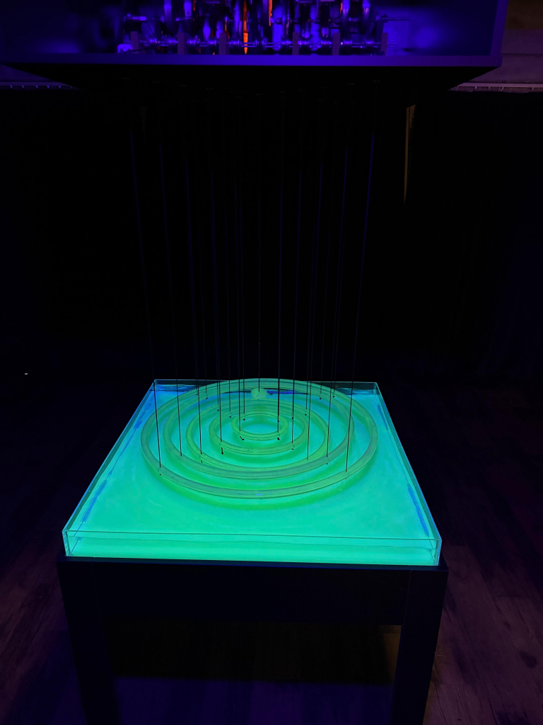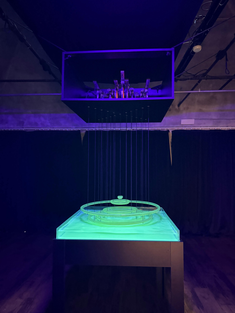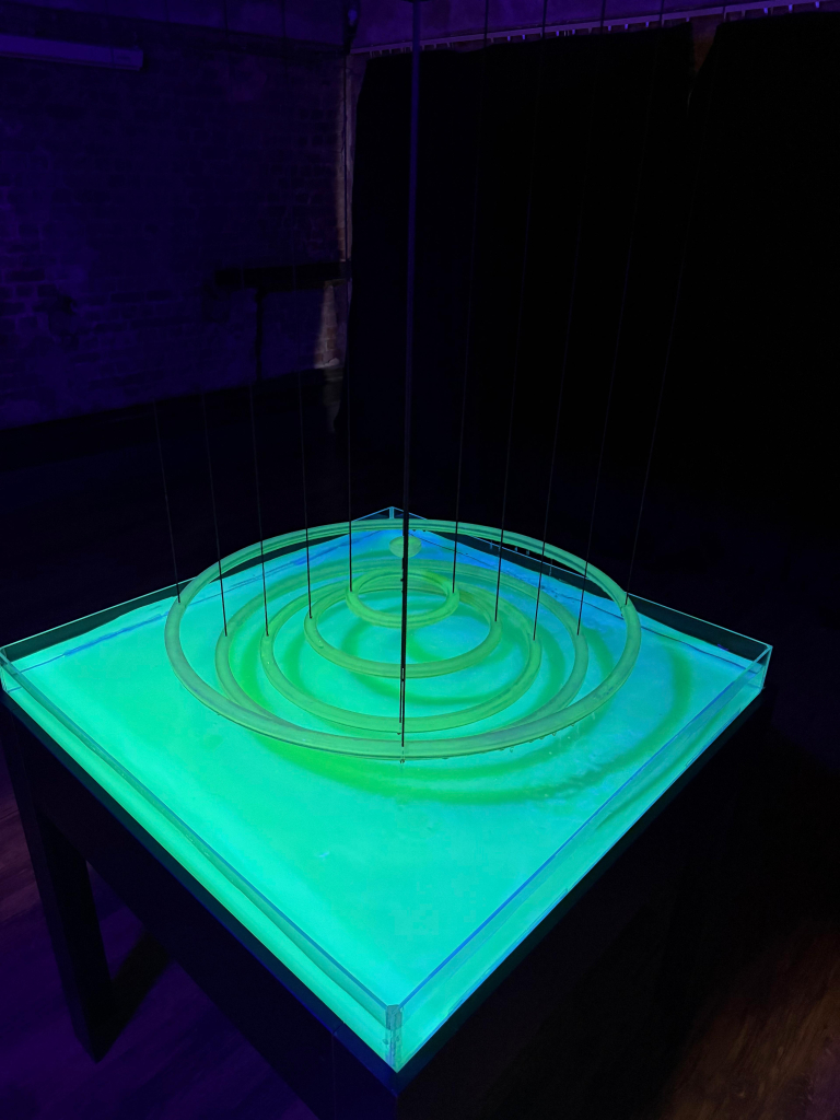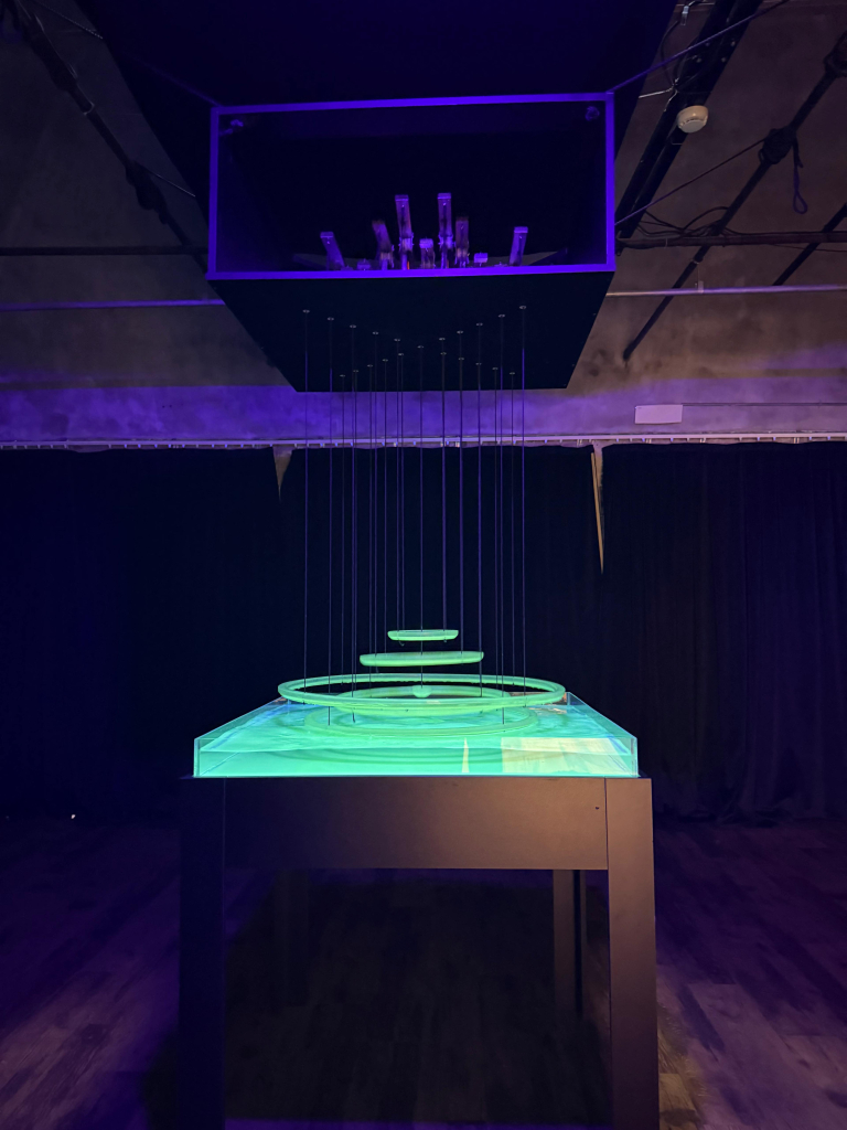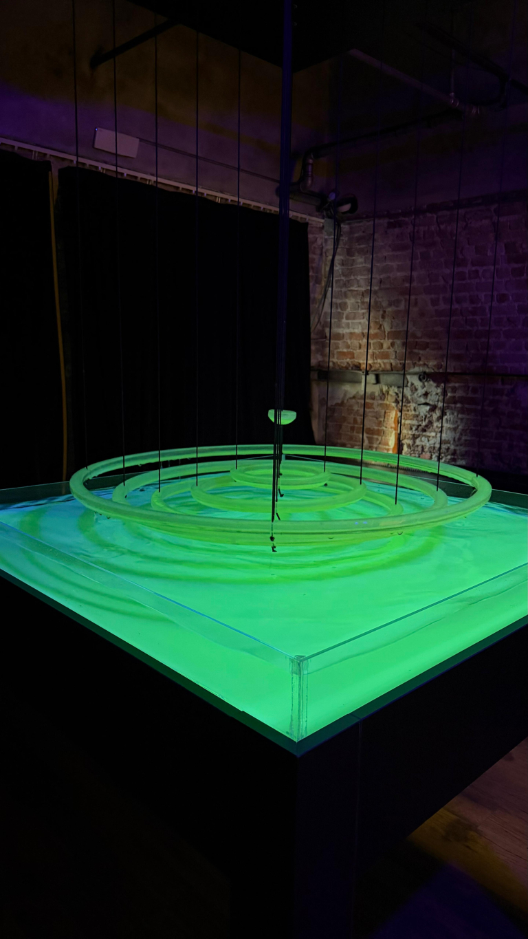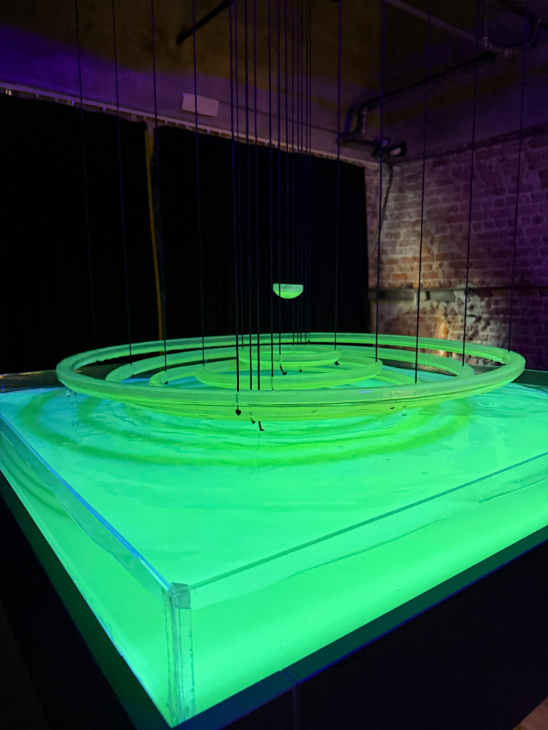 Aydoğan’ın sergide sanatseverlerle buluşan “Su Yolunda” adlı yerleştirmesi, Hasanoğlan Köy Enstitüsü’nden alınan bir görüntüden yola çıkıyor. Sanatçı, çalışmasında suyun akışını yalnızca fiziksel bir hareket olarak değil, mekânın belleğini duyuran bir eylem olarak ele alıyor. Damlaların mekânın yüzeyini doldurup geri çekilmesiyle oluşan döngü, mekânı sabit bir zemin olmaktan çıkararak heykelle birlikte “nefes alan” bir varlığa dönüştürüyor. Bu süreçte izleyici yalnızca dışarıdan bakan bir gözlemci konumunda kalmıyor; bedeniyle deneyimin bir parçası hâline geliyor. Su Yolunda, suyun sürekliliği üzerinden mekânın her temasla yeniden kurulduğunu hatırlatan bir anlatı sunuyor.