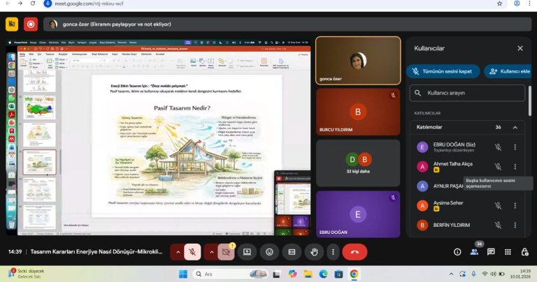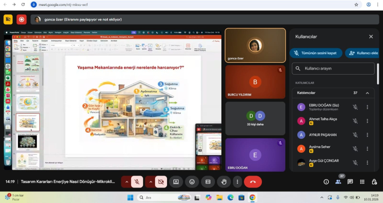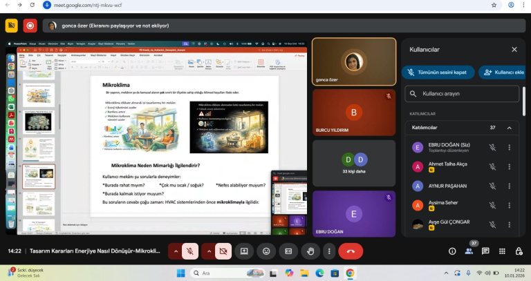 Seminer kapsamında, tasarımsal kararların enerji tüketimine doğrudan etkisi değerlendirilirken; güncel dijital analiz yöntemleri ve sensör teknolojileri üzerinden enerji performansının nasıl ölçümlenebileceği aktarıldı. Enerji etkin tasarımın temel kavramlarından biri olan mikroklima, pasif tasarım ilkeleri bağlamında ele alınarak; aynı iklim bölgesinde yer alan ancak farklı işlevlere sahip (konut, ofis/eğitim yapıları ve kamusal alanlar) binalar için nasıl özelleştirilebileceği örneklerle açıklandı.