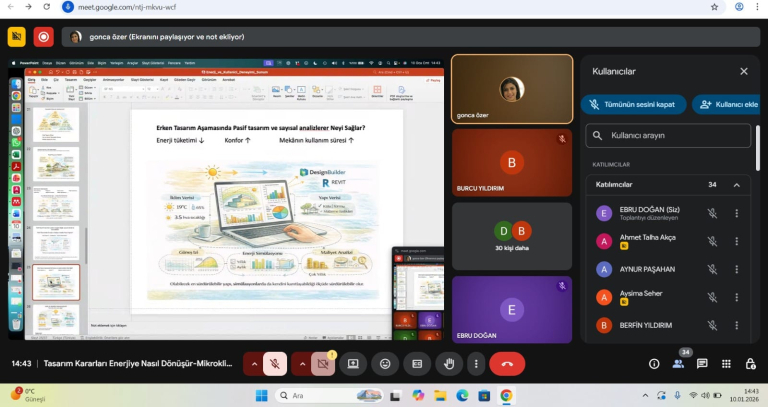 Seminerin dikkat çeken bölümlerinden birini ise sayısal simülasyon araçlarının tasarım sürecine entegrasyonu oluşturdu. DesignBuilder ve Revit gibi güncel yazılımlar aracılığıyla farklı tasarım senaryolarının enerji tüketimi, çevresel etki ve yaşam döngüsü maliyeti açısından nasıl karşılaştırılabileceği katılımcılarla paylaşıldı.