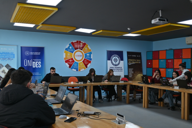 İç Mimarlık Bölümü İç Mimarlık Topluluğu tarafından yürütülen “Biyomateryal Tabanlı Akıllı Bina Kabuğu Tasarımı” başlıklı 5. ÜNİDES projesi, 2-9 Mart 2026 tarihleri arasında gerçekleştirildi. Gençlik ve Spor Bakanlığı tarafından desteklenen proje kapsamında İç Mimarlık öğrencileri, biyomateryallerin mimari tasarım süreçlerinde kullanımını, sürdürülebilir mimarlık yaklaşımlarını ve yeni üretim teknolojileri üzerine teorik ve uygulamalı çalışmaları gerçekleştirdi.