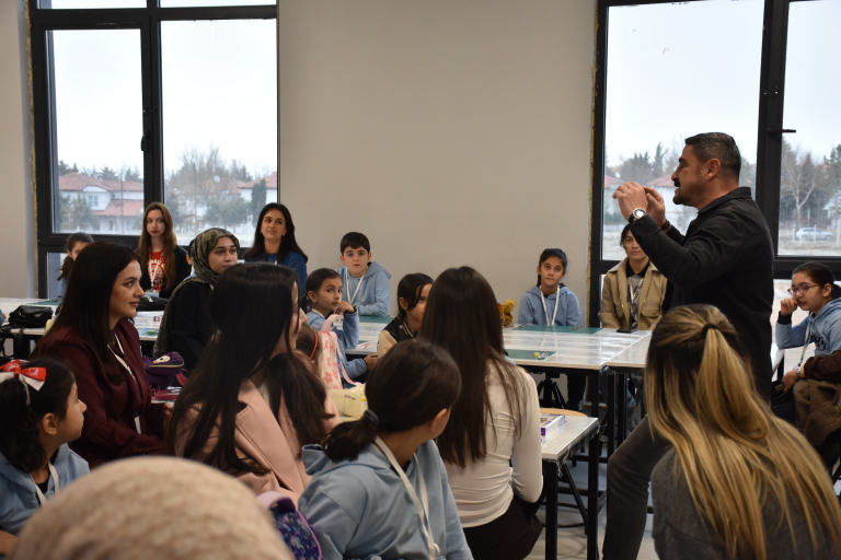 Projenin ilk gününün öğleden sonraki bölümünde İç Mimarlık lisans öğrencilerine yönelik teorik eğitimler gerçekleştirildi. İç Mimarlık Bölüm Başkanı Doç. Dr. Ebru Doğan tarafından yapılan açılış konuşması ve proje tanıtımının ardından Dr. Öğr. Üyesi Burcu Yıldırım, “Düşle, Projelendir, Üret: Yapay Zekâyla Görselleştirme ve 3D Printer ile Prototipleme Süreçleri” başlıklı sunumunu gerçekleştirdi. Sunumda analog çizimlerin yapay zekâ desteği ile üç boyutlu modellere dönüştürülmesi ve bu modellerin 3D baskı teknolojisi ile prototiplenmesi süreçleri ele alındı. Ardından Öğr. Gör. Ahmet Abuzeroğlu, “Fırçadan Kalbe: Çocuklarla Sanat ve Etkili İletişim” başlıklı konuşmasında ilkokul öğrencileriyle sanat temelli iletişim ve pedagojik süreçlere ilişkin deneyimlerini paylaştı.